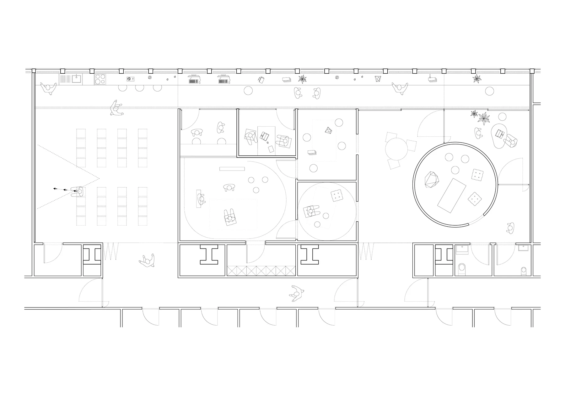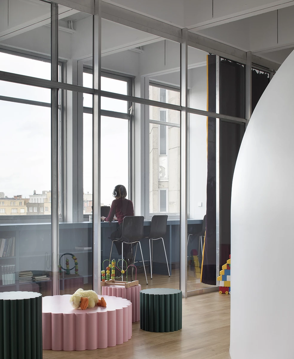ACTE is a research center dedicated to Autism Spectrum Disorder within the premises of Université libre de Bruxelles. This center provides experimentation and observation rooms, but also spaces where people with autism and their families can grow with confidence, inform themselves and attend scientific conferences. The center revolves around three large areas lined with two separated corridors on eachside. The experimental area, at the heart of the Center includes a big testing room, completely adaptable to respond to the requirements of each on-going study, a technical room in which experimenters can analyze the data collected and one interview room for adolescents and adults with autism and their parents. The conference area consists of a big seminar room. These three research areas and the conference room are complemented by a reception and waiting zone including an igloo shaped Snoezelen of which the design is entirely oriented towards the well-being of the participants: two waiting rooms are designed for children, namely a calm one and a more dynamic one to satisfyboth the needs of those who are seeking stimulation and those who can feel overwhelmed by too much sensory information.