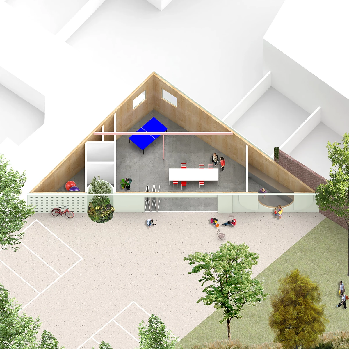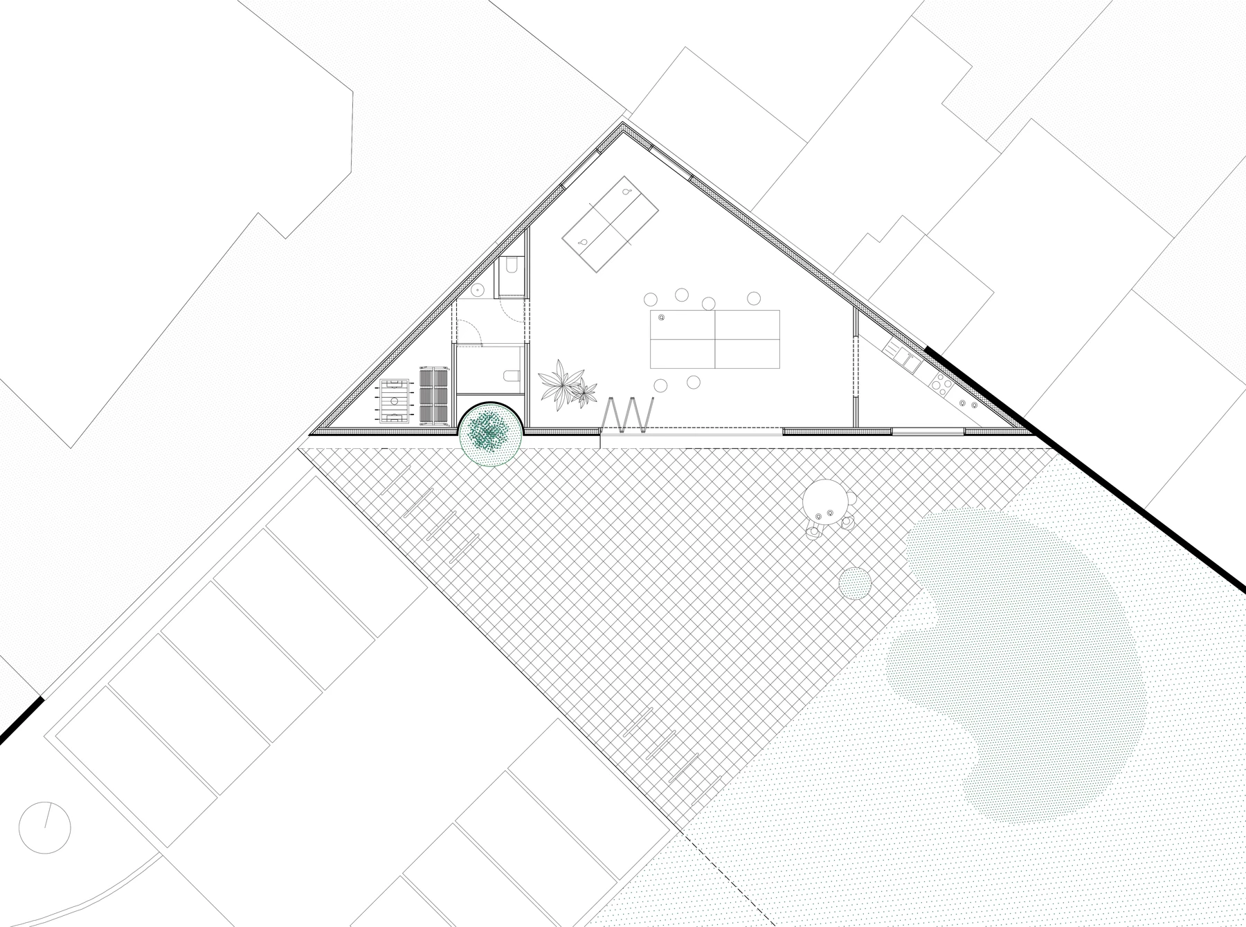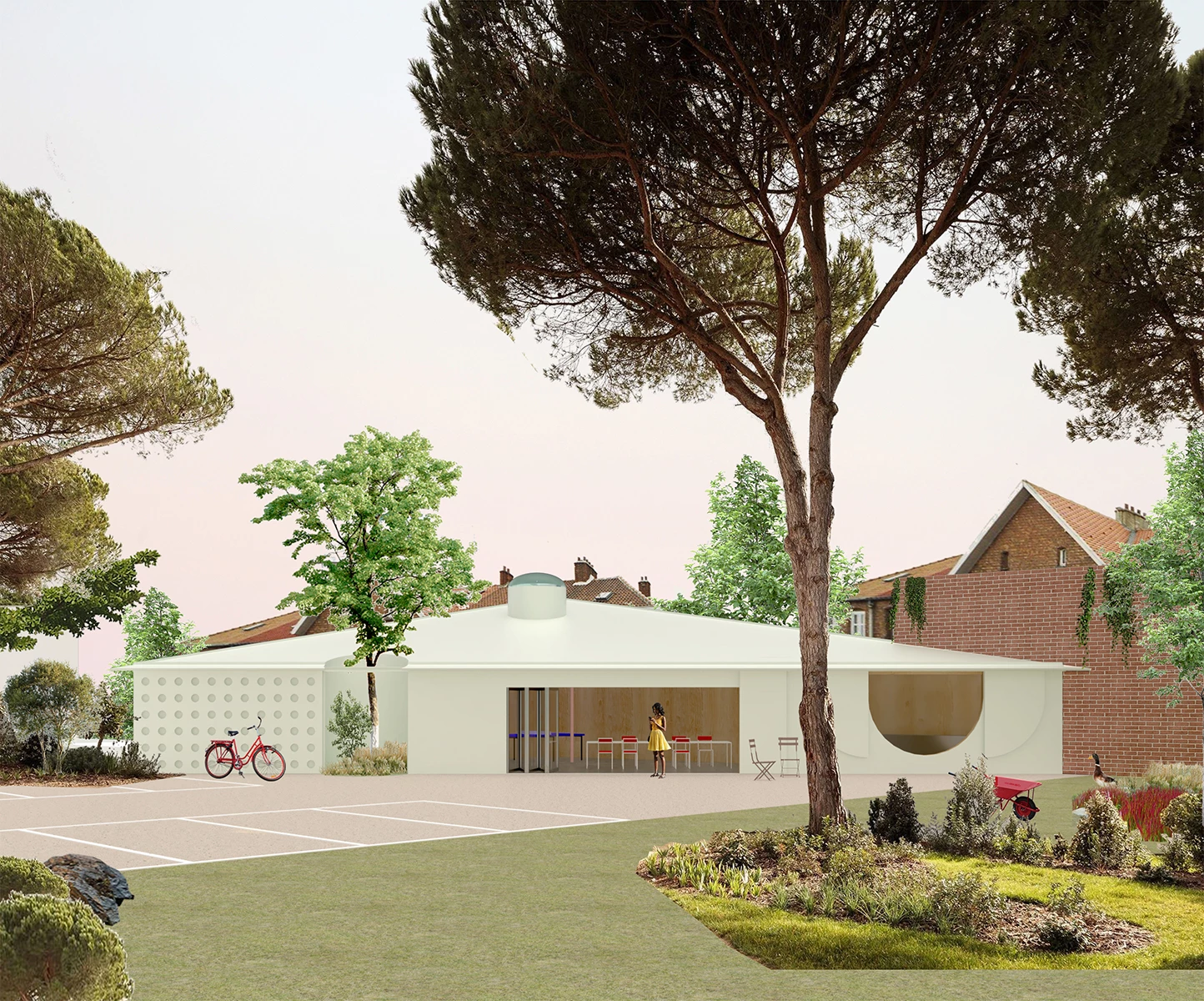 The Log’Iris community house addresses both the park and the parking area. Its interior space is designed in a simple and functional way, allowing a variety of present and future uses. In a contextual logic of relation with the new landscaped spaces of the district, the pavilion is oriented and framed by targeted openings. As a true sustainable pavilion, it is designed in a light prefabricated structure and wooden frame, the space used on the ground is replaced by a significant vegetation on the roof. This allows not only low vegetation but also small trees to grow, creating a special topography with the building while managing the vis-à-vis between collective and individual housing. Its architecture is totally integrated into the park while also taking on the role of a collective lantern for the neighbourhood, a visible and welcoming space aligned with its context.