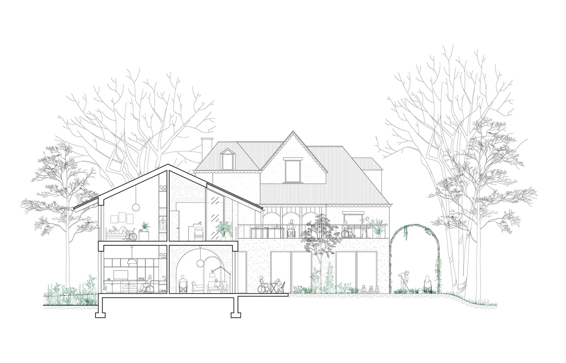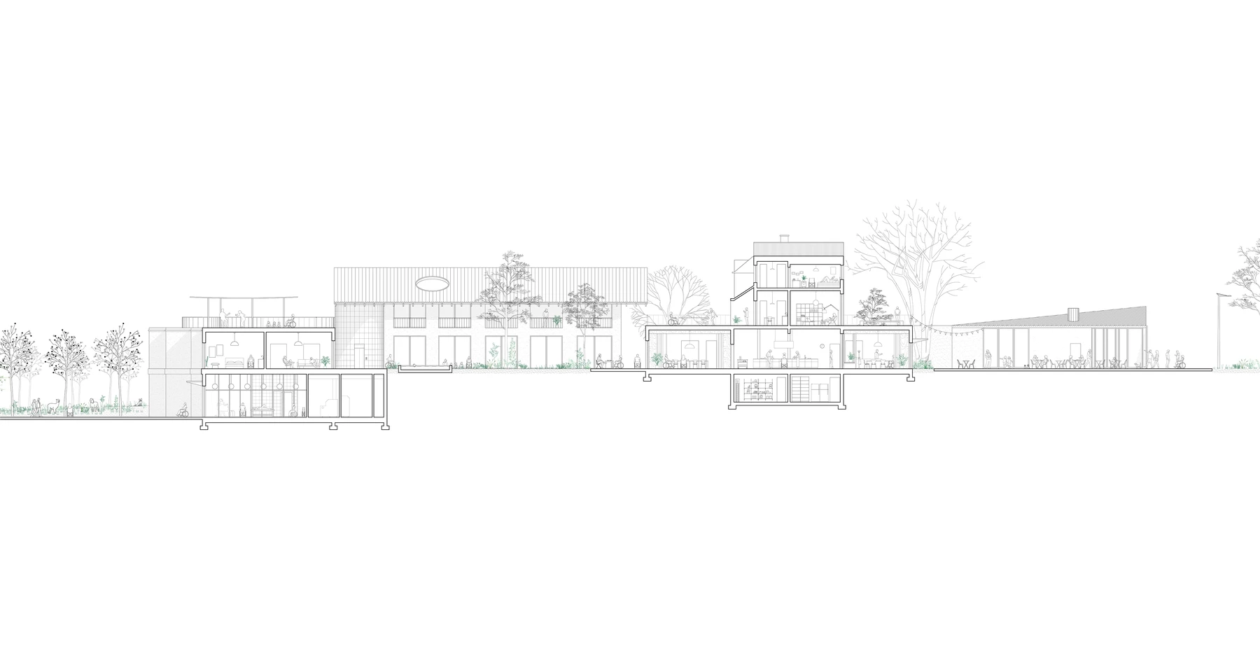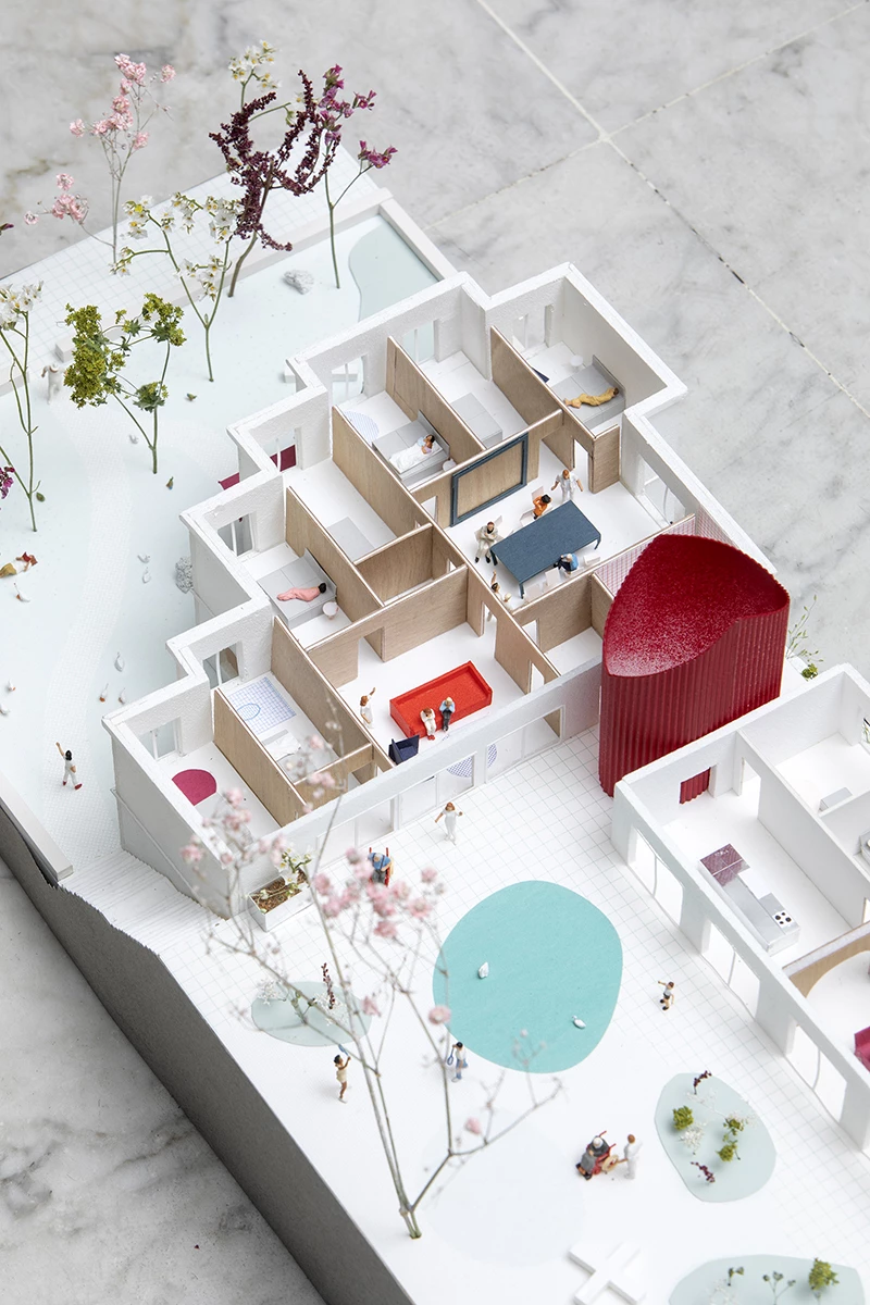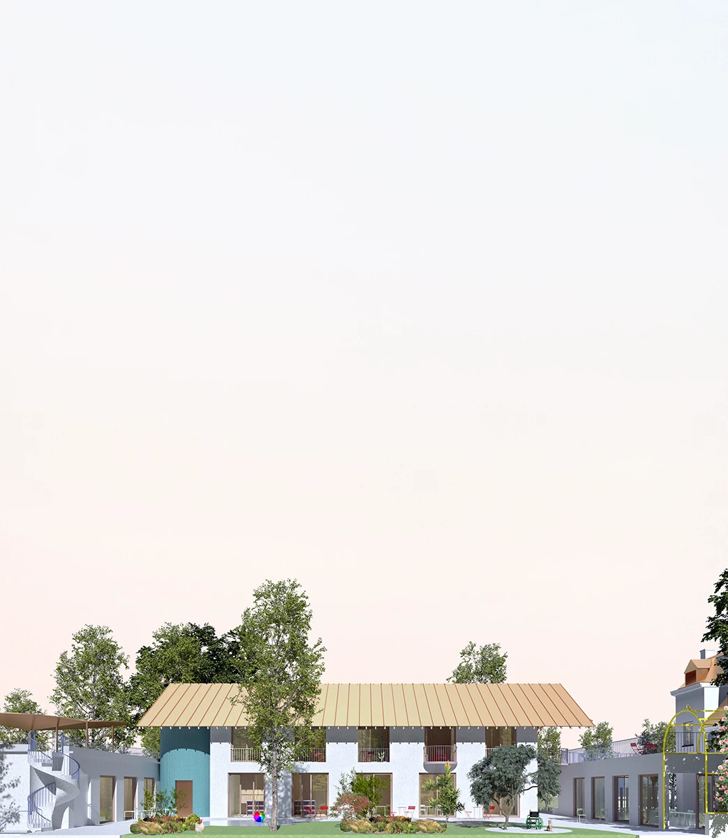 We imagined the center as a microcosm composed of different worlds that are brought to the disabled person. The idea is to create a place where domestic qualities, the home, rub shoulders with places of community, care, learning, but also isolation and intimacy.