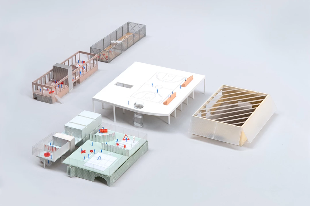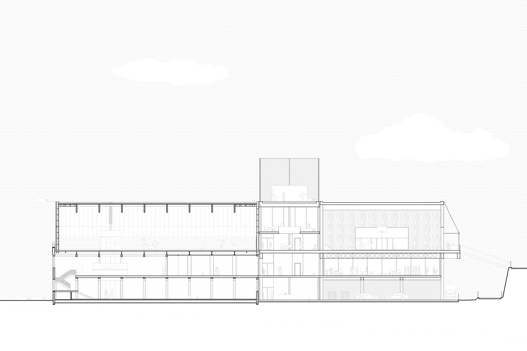 The building is envisioned as a relational structure, designed as a double-height concrete table: